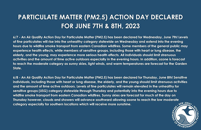 Parsippany, N.J. June 7, 2023 – The New Jersey Department of Environmental Protection (“NJDEP”) has issued a Code Red Air Quality Action Day across New Jersey for fine particulates, until midnight Thursday, June 8, 2023.
