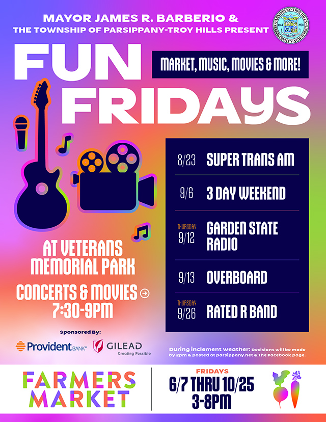 Posted August 20, 2024Mayor James R. Barberio and the Township of Parsippany-Troy Hills present Fun Fridays at Veterans Memorial Park. Concerts and movies will be from 7:30 to 9 p.m.