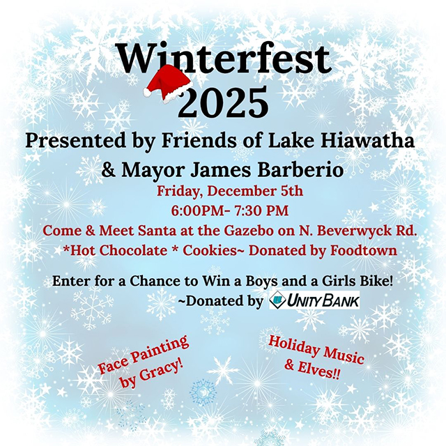 Posted November 17, 2025Mayor James R. Barberio invites you to celebrate the season at Winterfest 2025! Join the Township and Friends of Lake Hiawatha for a magical evening of holiday cheer on Friday, December 5th, 2025 from 6:00 PM to 7:30 PM at the Gazebo on N. Beverwyck Rd.